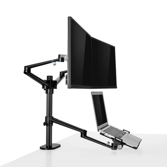 Soporte de Aluminio brazo doble para monitores hasta 32 y Laptop hasta 17 pulgadas 360°
