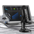 - Cuenta con un soporte base para el manejo y ajuste de ángulo del micrófono.
