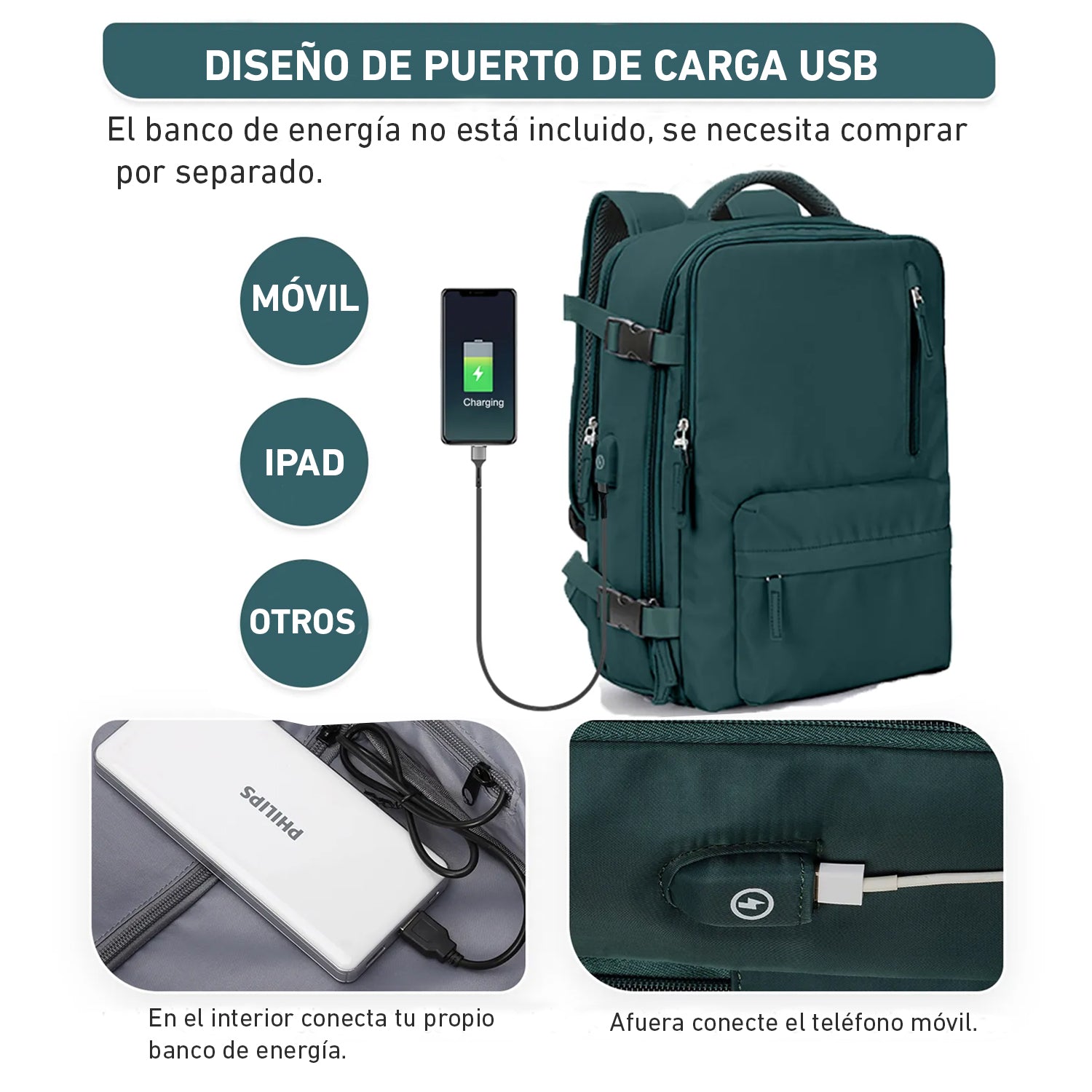 - Cantidad de bolsillos: 3 bolsillos en la parte exterior, 1 bolsillo lateral para botella de agua, 6 bolsillos internos y un compatimiento para calzado.